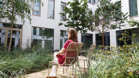 Met uw hulp hebben we de verbinding tussen Tergooi MC en de natuur uit de omgeving nog verder versterkt. Tergooi MC ligt in de uitlopers van de Utrechtse Heuvelrug. De Utrechtste Heuvelrug kenmerkt zich door drie soorten natuur: alleen bos, gemengd bos en tot slot zand, heide en dennen. Die drie natuurlijke elementen uit de omgeving komen terug in de patio’s. Dus een patio met alleen bomen, een patio met bomen en kleurige rhododendrons en een patio met zand, heide en dennen. Bijkomend voordeel: de verschillende patio’s helpen mensen zich te oriënteren in de gebouwen.