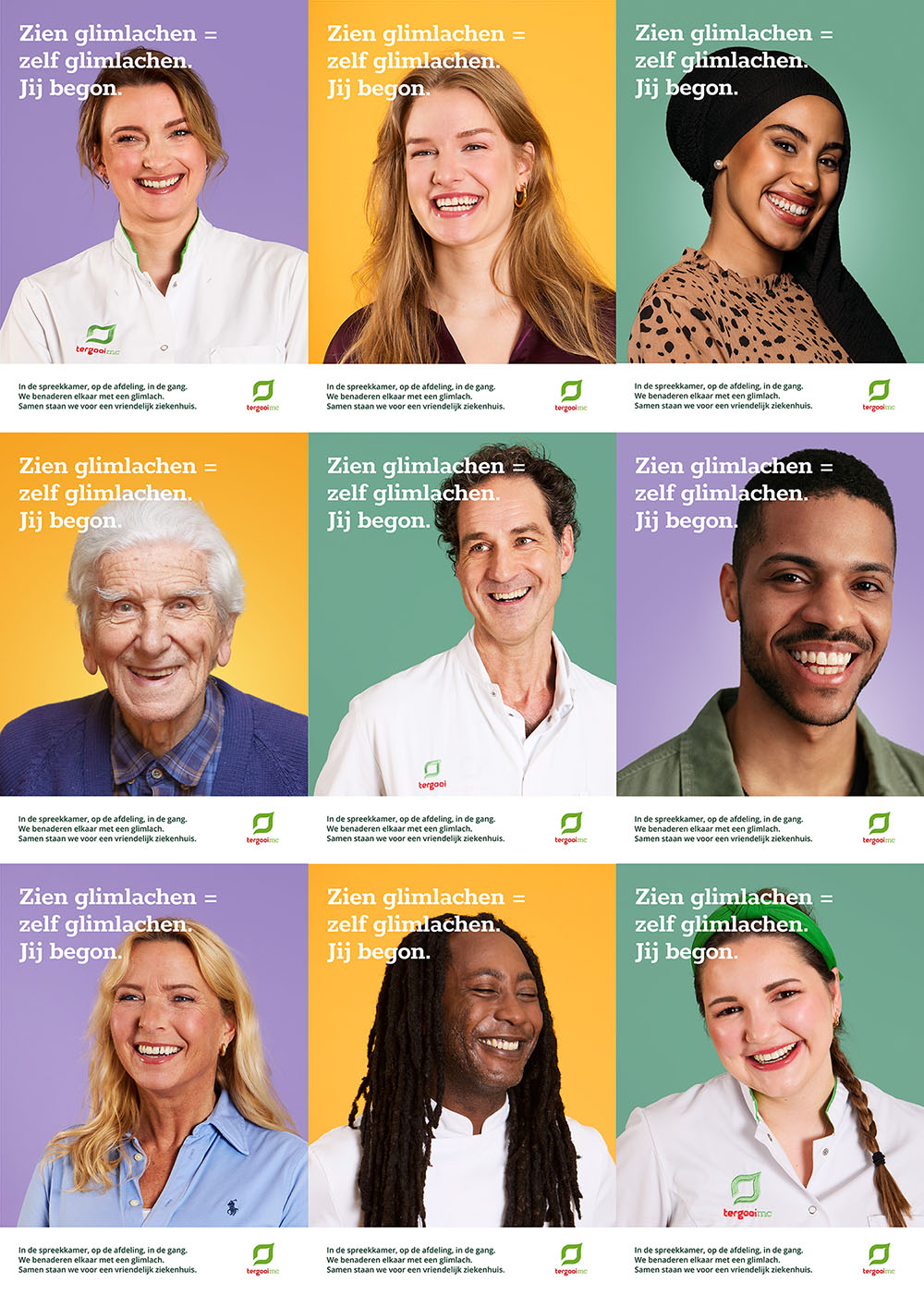 De glimlachcampagne bestaat uit posters en korte boodschappen op schermen in de wachtruimtes. Op de uitingen ziet u zowel onze eigen zorgverleners als patiënten. Zij laten samen zien hoe belangrijk prettig contact is in het ziekenhuis.