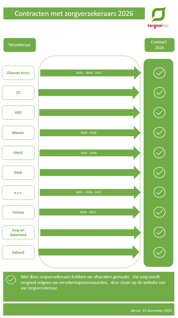 - Of uw verzekeraar een contract heeft met Tergooi MC, zie hiervoor ook contractering zorgverzekeraars.
