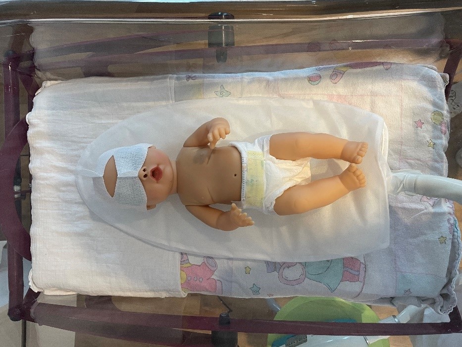 - Bedek de ogen van uw baby met het brilletje.