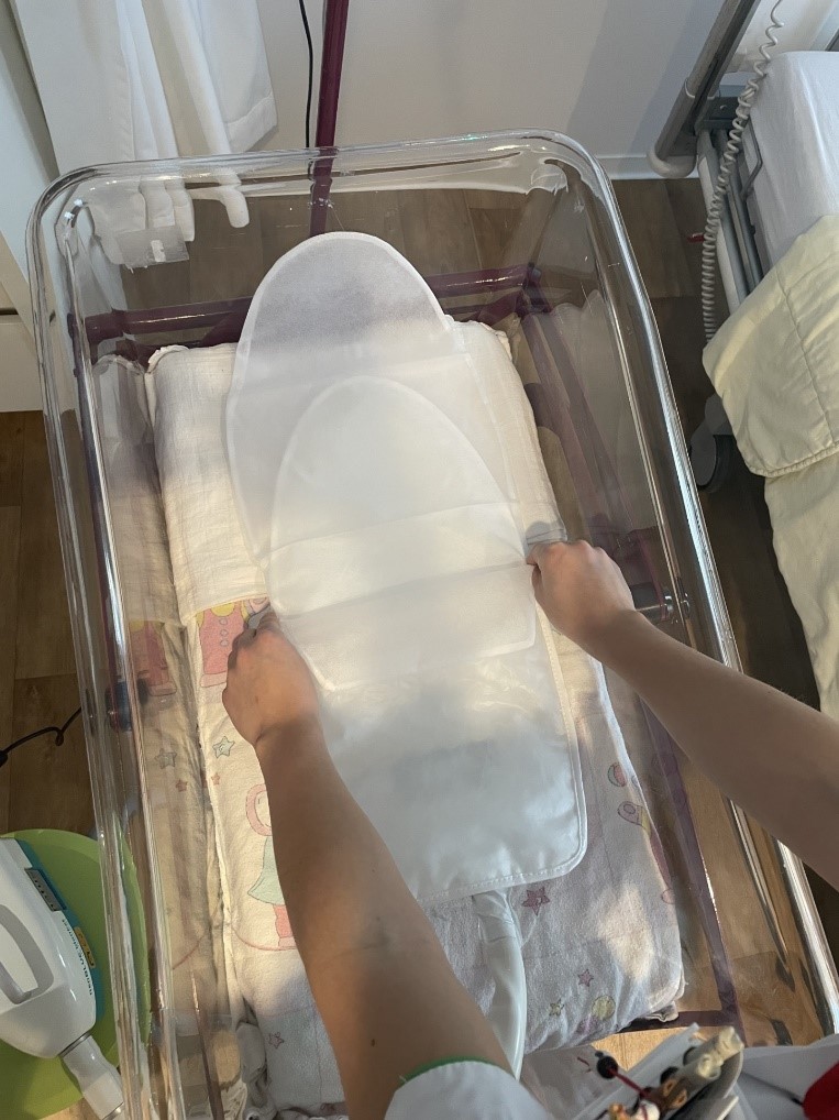 - Zorg dat de biliblanket met de lampen naar boven ligt.