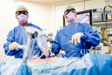 Bij een kijkoperatie met robotassistentie gebruikt de uroloog een operatierobot om de ingreep uit te voeren. De uroloog beweegt de armen vanuit de operatierobot van de console.
